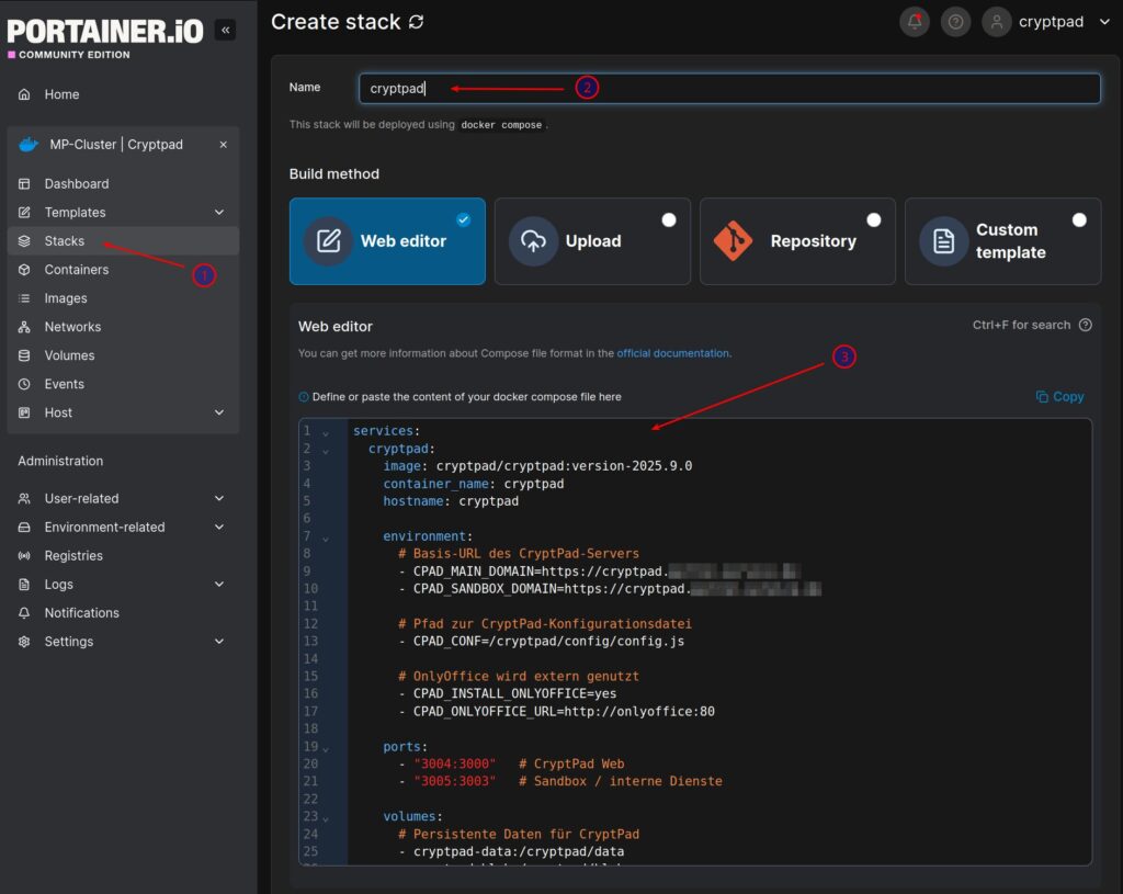 • In Portainer geht zu Stacks --> + Add stack. Vergebt einen Namen z.B. „cryptpad“. In den Web Editor kopiert ihr die docker compose yaml die ihr weiter unten findet,