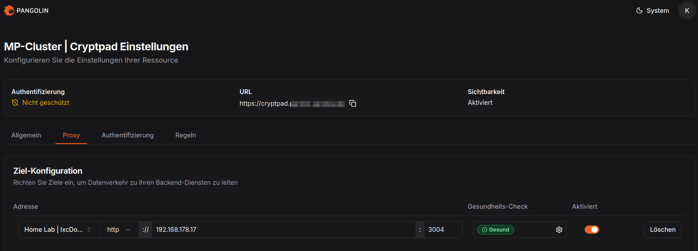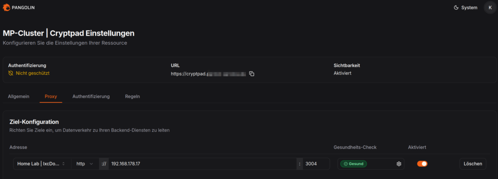 • Erstellt eine Domain in eurem Proxy. Ich nutze Pangolin. Genau so gut geht aber auch einfach NGINX oder NIGINX-Proxy-Manager. Damit Cryptpad funktioniert, ist SSL mit einem gültigen Zertifikat Voraussetzung.
